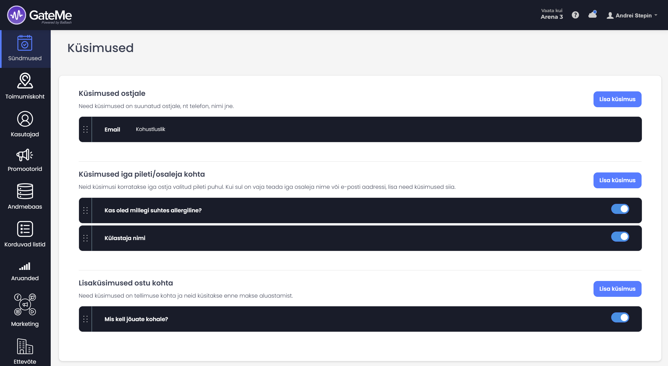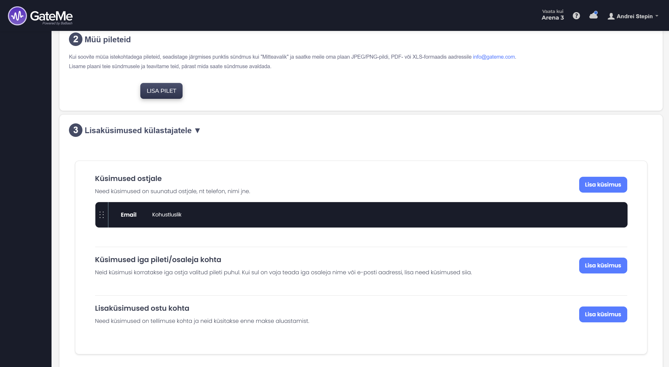 Antud samm muutub kättesaadavaks pärast piletite lisamist ürituse loomisel. See on nähtav kui 3. samm: Lisaküsimused külastajale. Sa saad lisada erinevaid küsimusi vastavalt oma vajadustele ning määrata, kas need on kohustuslikud.